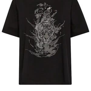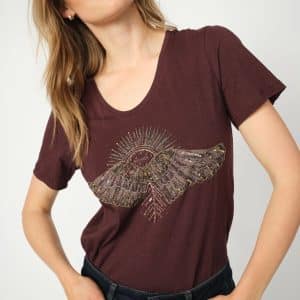 79,99 €This beautifully fitted tee showcases intricate detailing at the front, making it a true standout piece. Featuring a striking combination of hand-beaded and embroidered artwork, it highlights angel wings and a radiant sunburst design for an artistic touch. Wear it with jeans for an effortlessly chic outfit or layer it under a blazer for a sophisticated, polished look.