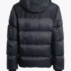 The fabric is a down proof 100% polyester matte finish taffeta, with water repellent treatment. Filling is 90% duck down – 10% duck feathers. This jacket has a hood adjustable by means of drawstring and a two-way zipper. The jacket features four invisible zippered pockets in front, as well as an inner pocket. Underarm vents, lycra trimmed hood and cuffs. It features iconic details such as the patch.