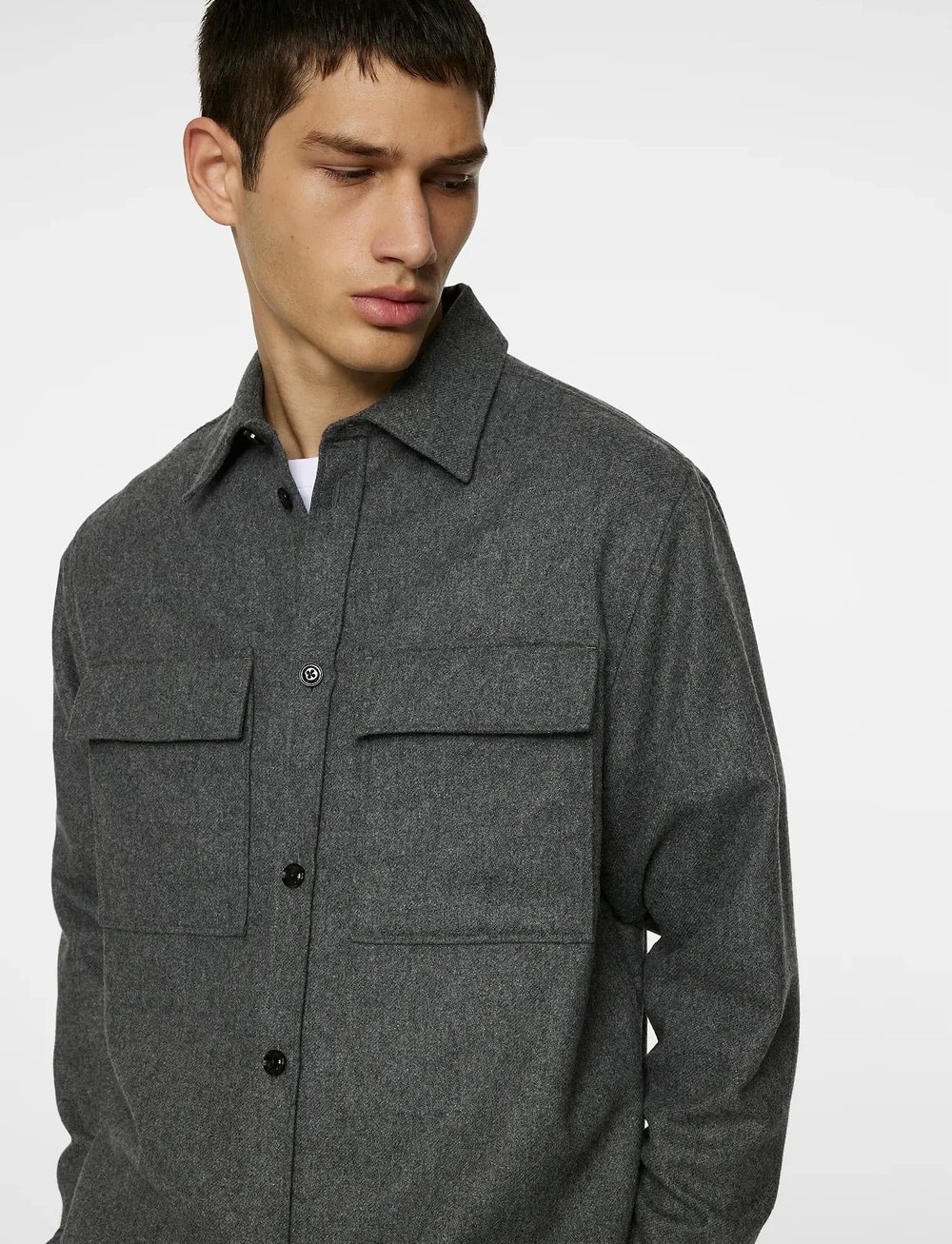 Tailored warmth in a minimalist layer. The Flat Wool Overshirt is cut from a soft, premium wool blend with buttoned chest pockets and an unlined structure for lightweight layering.