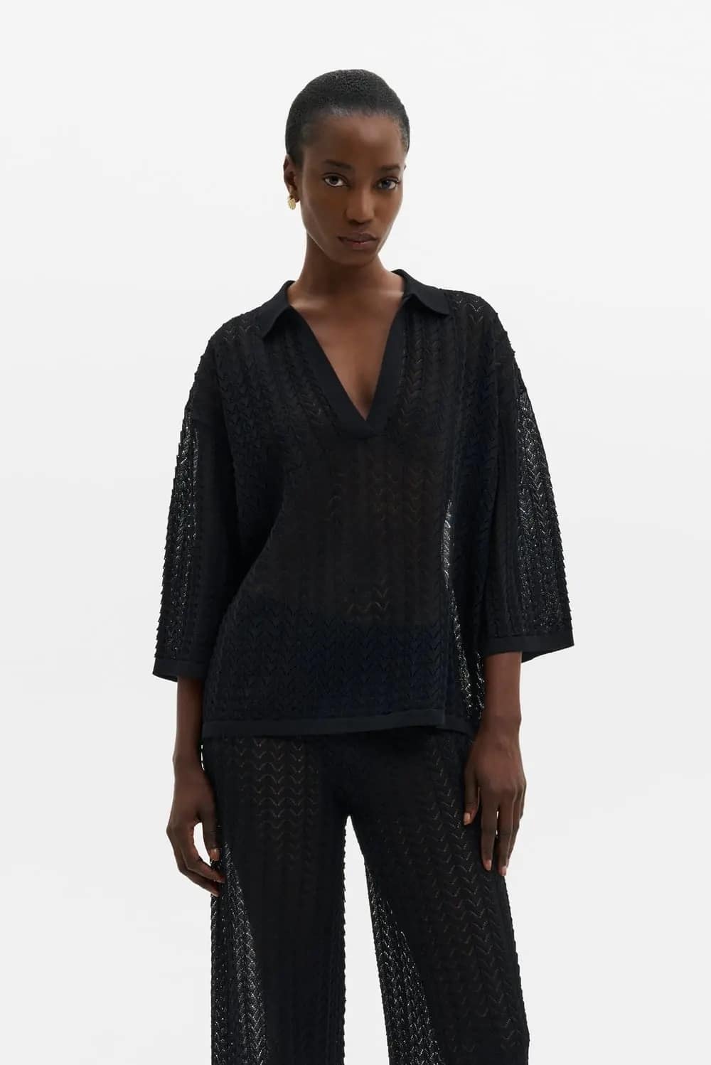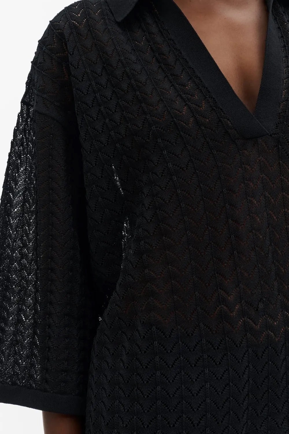Pointelle knitted polo shirt with a V neckline.