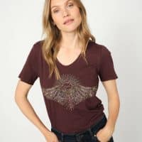 This beautifully fitted tee showcases intricate detailing at the front, making it a true standout piece. Featuring a striking combination of hand-beaded and embroidered artwork, it highlights angel wings and a radiant sunburst design for an artistic touch. Wear it with jeans for an effortlessly chic outfit or layer it under a blazer for a sophisticated, polished look.